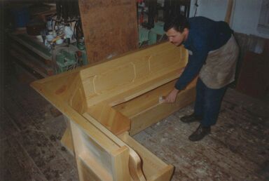 Diese Eckbank komplettiert eine mit Bauernmöbel eingerichtete Küche.
